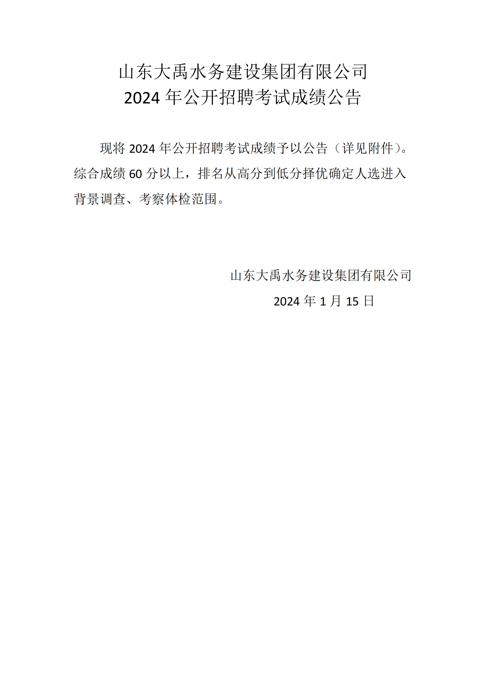 山東大禹水務建設集團有限公司2024年公開招聘考試成績公告