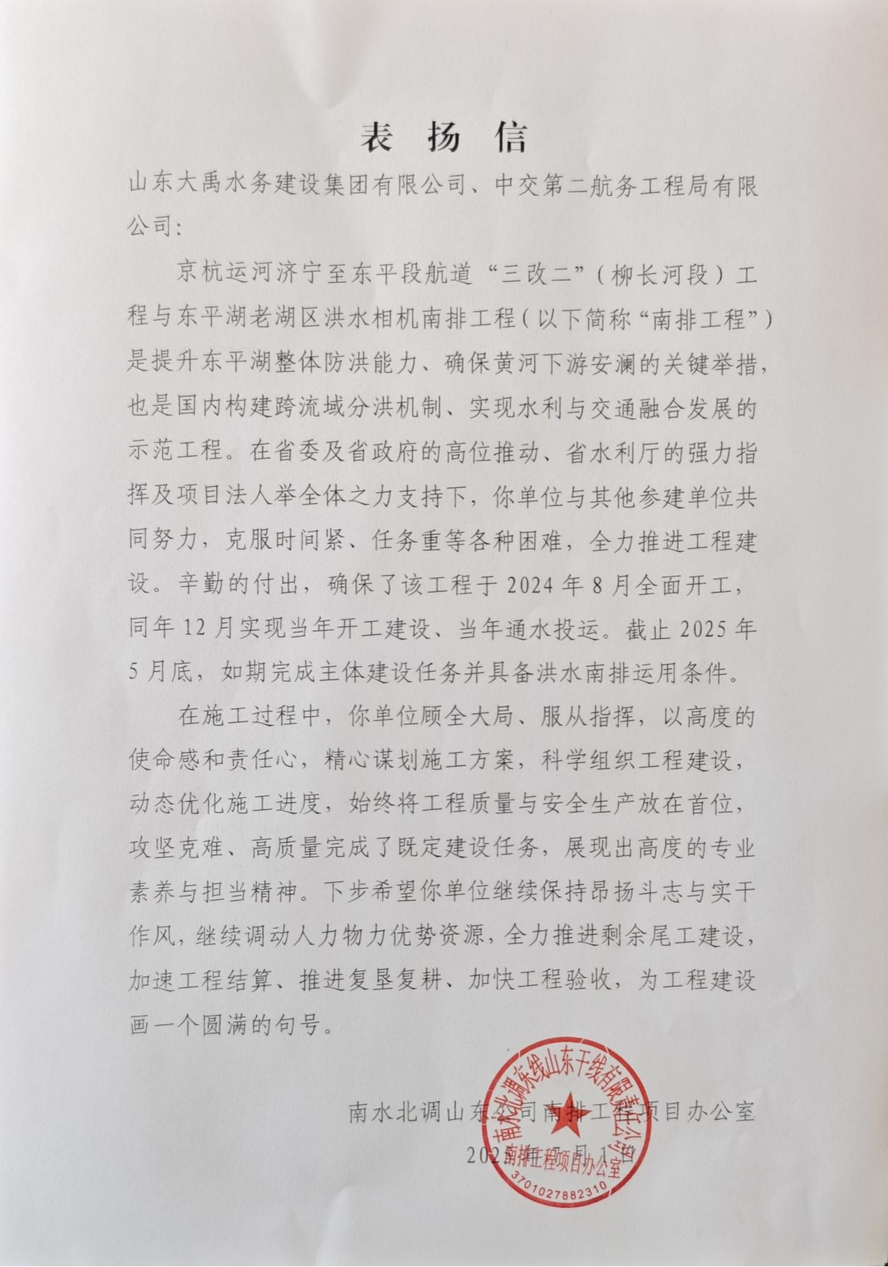 近日,集團公司收到一封滿含認可與鼓勵的表揚信,表揚集團公司在京杭運河濟寧至東平段航道 “三改二”(柳長河段)工程與東平湖老湖區(qū)洪水相機南排工程航運與洪水南排結合段施工8標的施工過程中精心組織、攻堅克難,高質量完成既定建設任務,為工程按期投入使用打下堅實基礎。